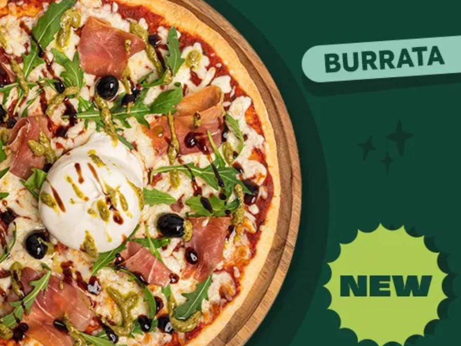 Préparée sur une base de sauce tomate parfumée, la pizza Burrata est garnie de mozzarella française fondante, de jambon de pays savoureux et d’olives. Une fois sortie du four, elle se pare de roquette fraîche, d’une généreuse burrata crémeuse, d’un filet de pesto alla genovese et d’une touche de crème balsamique de Modène IGP. Ce jeu de textures et de saveurs crée une harmonie parfaite entre le fondant, le croquant et le relevé.
